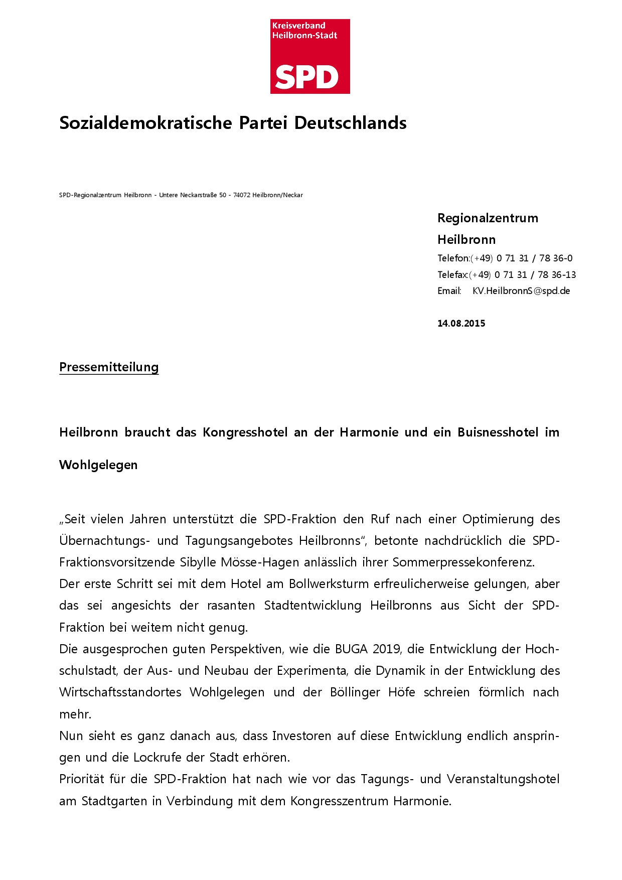 Pressemitteilung zum Kongresshotel an der Harmonie und Businesshotel im Wohlgelegen