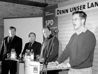 Beim Juso-Landestreffen am Dreikönigsabend flackert die freche Unbekümmertheit der jungen Garde im Heilbronner Deutschhofkeller nur ansatzweise auf. „Die Promis“, merkt Heilbronns Juso-Kreischef Christian Eheim an, „werden gleich kommen“. Mit „Promis“ meint er den neuen SPD-Landesgeneralsekretär, Jörg Tauss, Heilbronns SPD-Bundestagsabgeordneten Josip Juratovic und den SPD-Landtagswahlkandidaten Herbert Burkhardt. Lange lassen „die Promis“ auf sich warten. Als sie mit 45-minütiger Verspätung endlich auftauchen, werden sie von starkem Applaus der 100 Besucher empfangen.
