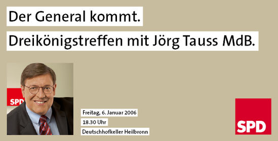 Die baden-württembergischen Jusos veranstalten ihr landesweites Dreikönigstreffen im Jahr 2006 in Heilbronn. Als Hauptredner wird am 06. Januar um 18.30 Uhr im Deutschhofkeller der Generalsekretär der baden-württembergischen SPD, Jörg Tauss MdB, erwartet. Weitere Gäste sind Landtagskandidat Herbert Burkhardt, Juso-Landesvorsitzender Hendrik Bednarz und der Unterländer Bundestagsabgeordnete Josip Juratovic.