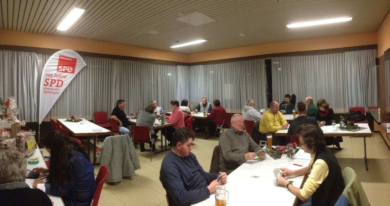 Der erste Nikolaus-Preisbinokel des SPD Ortsvereins Böckingen wurde von den knapp zwanzig Teilnehmern durchweg positiv bewertet. Das gemütliche Ambiente im Rombach-Zimmer, liebevoll dekorierte Spieltische und die herzliche Atmosphäre waren Indiz für einen reibungslosen Ablauf des Abends. Kassierer Markus Rieger hatte die Idee das traditionsreiche, schwäbische Kartenspiel wiederzubeleben. Mit seinem Team um die Ortsvereinsmitglieder Martina Rieger und Rabea Keller organisierte er die Veranstaltung und konnte mit einem hochwertigen Gewinnangebot aufwarten. Begrüßungsworte sprach zudem Stadtrat, Herbert Tabler, der auch auf die Wahrung bewährter Traditionen Wert legte. Die Teilnehmer fanden sowohl vom Landkreis, als auch vom Stadtgebiet und nicht zuletzt aus Böckingen, den Weg ins Bürgerhaus. Zuspruch kam von allen Seiten. Des Weiteren wünschten einige Mitspieler Informationen über zukünftige Aktivitäten des Ortsvereins. Bei der Betrachtung der Preise stellte Teilnehmer Emil Scholpp fest, dass dies viel Engagement vom Organisationsteam verlangen würde. Und auch die Siegerin, Halyne Albrecht, aus Herbolzheim zeigte sich hocherfreut über ihren errungenen Preis. Nachdem diese Auftaktveranstaltung so gut angenommen wurde, steht einer Fortsetzung nichts im Wege.