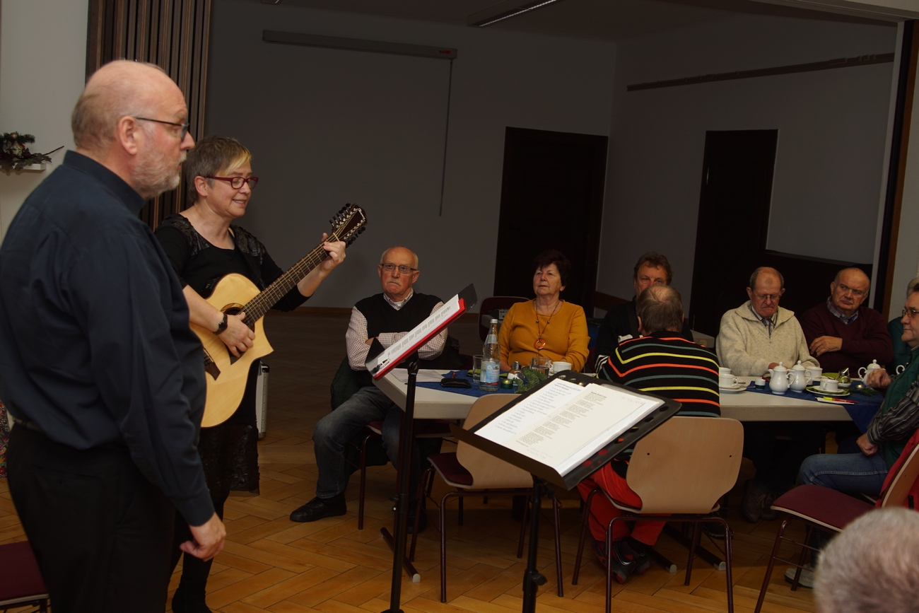 Zu einem Jahresabschlusstreffen der besonderen Art hat, in dieser von Umbrüchen geprägten Zeit, die SPD-Arbeitsgemeinschaft 60 plus Heilbronn Stadt und Land eingeladen: Zu engagierten, demokratischen und kritischen Liedern, die zur Kultur der Sozialdemokratie gehören. Silke Ortwein und Bernhard Löffler, beide beim DGB Nordwürttemberg in verantwortlicher Position tätig, sind Teil der aus den NaturFreunden hervor gegangenen Musikgruppe „Die Marbacher“, die bekannt ist für „politische Lieder, die Stellung beziehen“. Schwungvoll und kreativ, mitreißend und nachdenklich unterhielten sie mit Gesang und Gitarre die über vierzig SPD-Senioren und Seniorinnen. Man spürte, dass die beiden mit viel Engagement und Spaß im Einsatz sind. Kein Wunder, denn neben „klassischen“ Arbeiter- und Protestliedern gaben sie doch auch selbst geschriebene und komponierte Werke zum Besten.