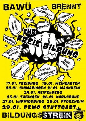 In den letzten beiden Januarwochen finden im Rahmen des „Bildungsstreiks 2011“ in ganz Baden-Württemberg Demonstrationen und Veranstaltungen statt, um für eine bessere Bildungspolitik zu werben. Daran beteiligen sich neben Studierendenvertretungen, gewerkschaftlichen Jugendorganisationen und Zusammenschlüssen von Schülerinnen und Schülern auch parteinahe Jugendverbände. Der Juso-Kreisverband Heilbronn schließt sich dem an und ruft zur Teilnahme am „Bildungsstreik 2011“ auf. Die zentrale Aktion in der Region Heilbronn wird am kommenden Samstag, den 22.Januar, ab 12 Uhr auf dem Heilbronner Kilianssplatz stattfinden.