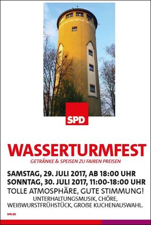 Bereits zum 29. Mal veranstaltet der SPD Ortsverein Böckingen in diesem Jahr das beliebte Wasserturmfest im größten Stadtteil Heilbronns. In gemütlicher Atmosphäre unter dem Wahrzeichen Böckingens werden, wie gewohnt, Speisen und Getränke von hiesigen Unternehmen angeboten. Die Veranstaltung beginnt am Samstag, 29.07.2017, ab 18:00 Uhr. Für musikalische Unterhaltung sorgen die Kanu-Lerchen mit Gesangseinlagen und am späteren Abend spielt eine Musikgruppe aktuelle Stimmungsmusik, Oldies sowie auch Schlager. Der Sonntagmorgen beginnt mit dem traditionellen Weißwurstfrühstück ab 11:00 Uhr. Auch hier wird für musikalische Untermalung durch einen gemischten Chor gesorgt. Am Sonntag um 14:00 Uhr steht zudem ein Impulsvortrag über den Mostbirnenweg auf dem Programm. Ein reichhaltiges Kuchenangebot findet seit vielen Jahren regen Absatz. Der Ortsverein würde sich über zahlreiche Besucher bei bestem Festwetter freuen.